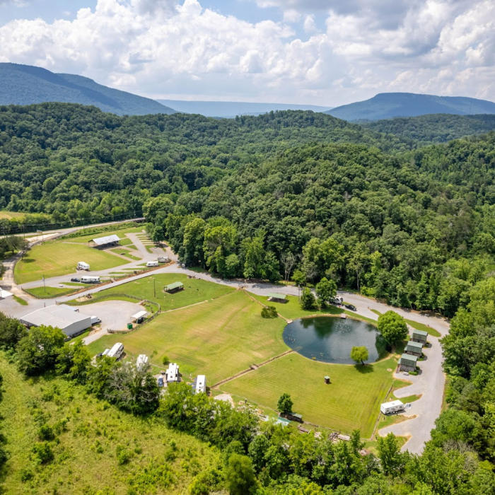 This shows our large level rv site pads This shows the full hookups at one of our rv sites aerial view of our pond, rv sites and cabins